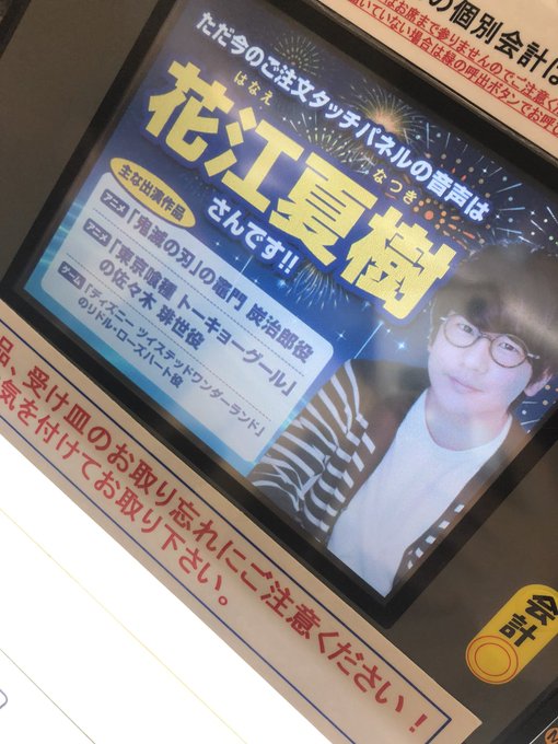 タッチパネルの声、 まさか声優さんとは知らず、 「声優さんの中でもピンキリのキリの人じゃない?」 などと言いながら食べていたら まさかの花江夏樹さんでした・・・・m(__)m 好きなのに! 炭治郎(鬼滅)とか兄者(刀剣)とか! あとスマホゲーでは それに、はま寿司と言えば100円皿は平日90円ですよね。 タッチパネルでもちゃんと90円表記になっていました! 今までのタッチパネルでは平日でも100円表記だったような? 会計時にはちゃんと90円になってましたが記憶があいまいですみません。